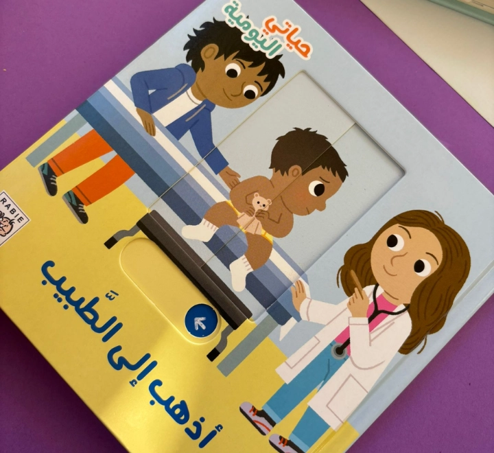 كتاب صفحات متحركة يشجع طفلك للذهاب الى الطبيب – أَنا ذاهِبٌ إِلى العيادَةِ اليَوْمَ. أَخْلَعُ سُتْرَتي، وأَفْتَحُ فَمِي، وأَتَنَفَّسُ شَهِيقاً وزَفِيراً. كِتابٌ لِتَعلُّمِ زِيارَةِ الطَّبِيبِ بِثِقَةٍ!