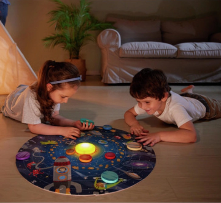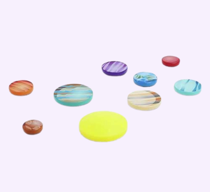 ثم ضع أيضًا جميع الكواكب المختلفة (8 نجوم خشبية) في أماكنها المناسبة في النظام الشمسي.