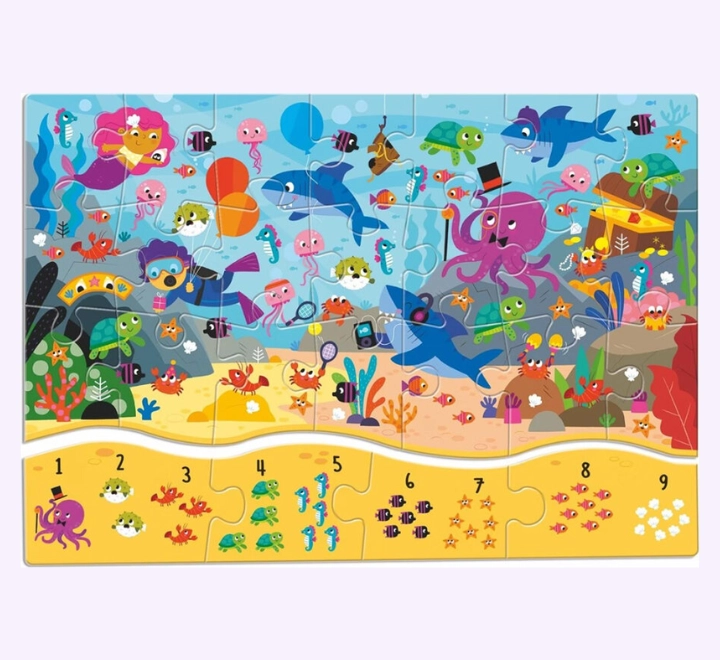 – يطلب من الطفل يعدّ الكائنات الموجودة في المشهد البحري ويحاول يوصل كل رقم مع المكان المناسب