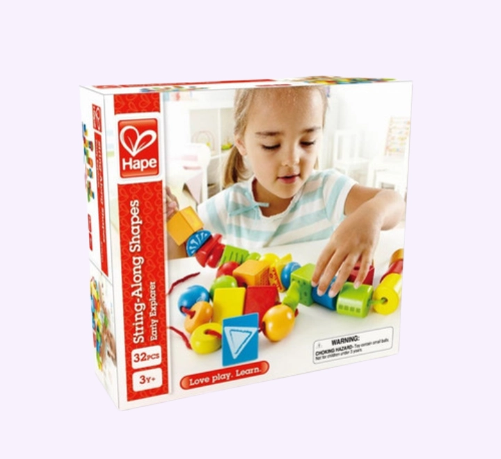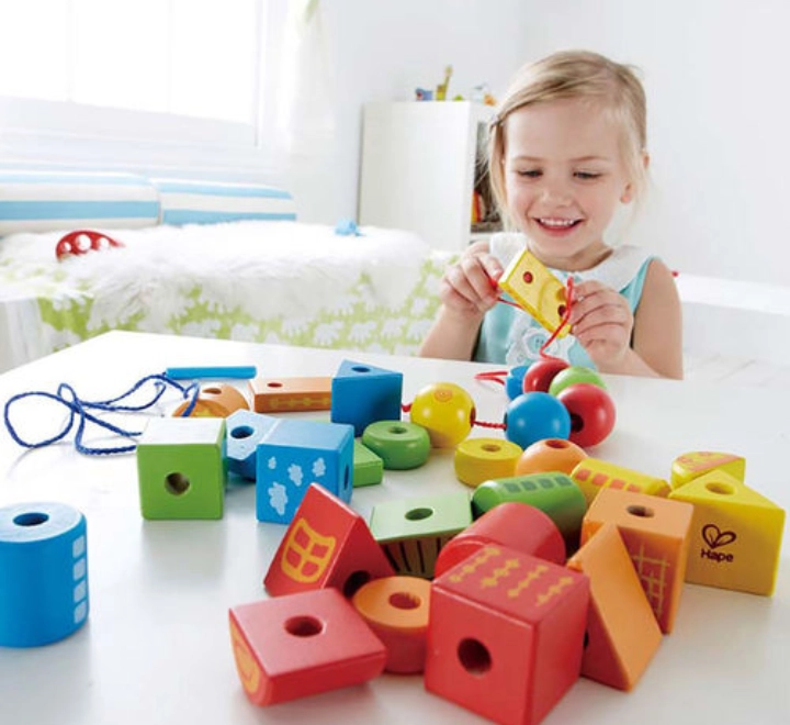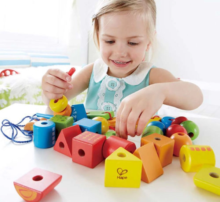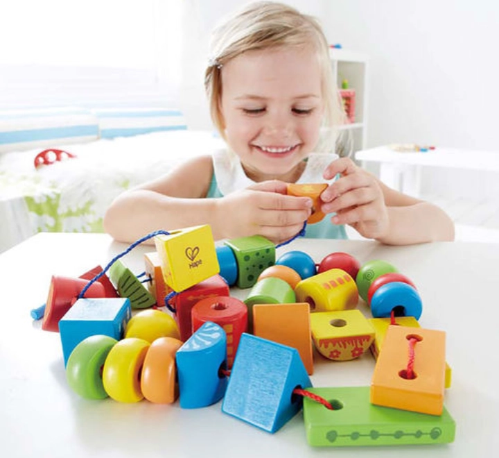 حوالي 30 مكعبًا خشبيًا ملونًا بأشكال مختلفة، بالإضافة إلى خيطين مع قضيب في نهايتهما، مما يسهل عملية إدخال الخيط! جميع الخرزات والأشكال الخشبية مزودة بفتحات كبيرة، مما يجعل عملية إدخال الخيط سهلة وممتعة.