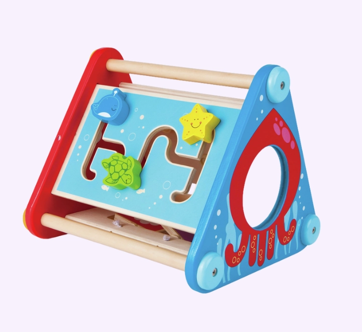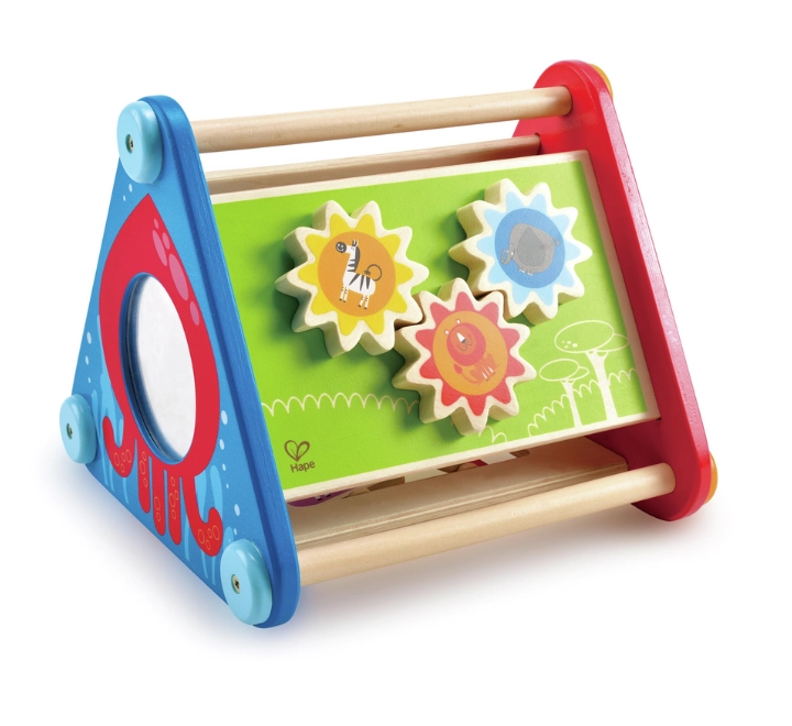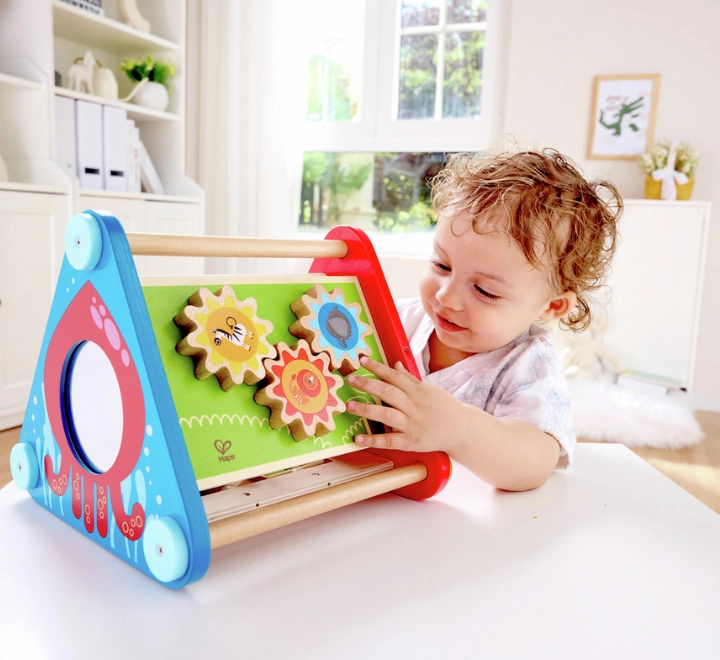 صندوق الأنشطة ذو الخمسة جوانب يحتوي على تروس متحركة، وكرات، ومكعبات، ومتاهة، بالإضافة إلى ألوان وحركة ومرآة تعكس ابتسامة طفلك.