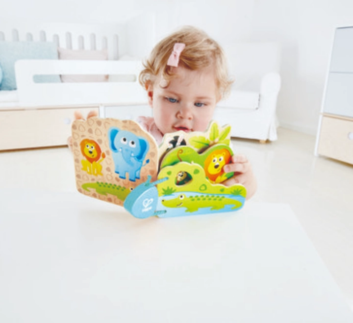 كتاب أنشطة رائع للأطفال مصنوع من الخشب برسومات خلابة. يتكون الكتاب من أربع صفحات بألوان متنوعة، وهو مصنوع من خشب خفيف وآمن للاستخدام.