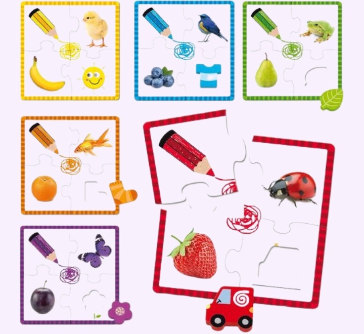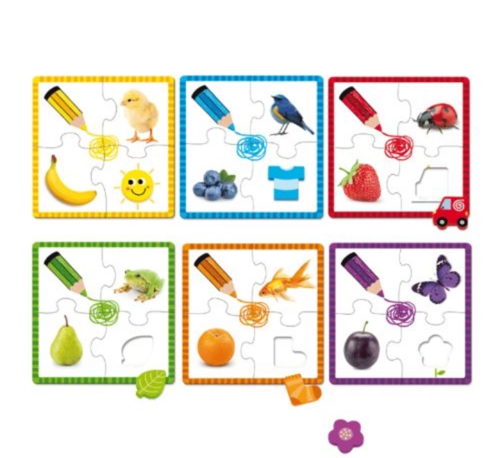 انتبهوا! تحتوي كل بازل على 4 عناصر تتكرر في نفس المواقع. يوجد في كل بازل حيوان في أعلى اليمين، وقلم رصاص من نفس اللون في أعلى اليسار، وفاكهة في أسفل اليسار، وعنصر واحد يتغير في كل بازل – في أسفل اليمين. يمكنكم توزيعها على العائلات مع الأطفال الصغار – على سبيل المثال، “هل نستطيع جمع كل الحيوانات معًا؟” أو “ما هي الفواكه التي تجدونها؟ هل هناك فاكهة تُفضلونها؟”