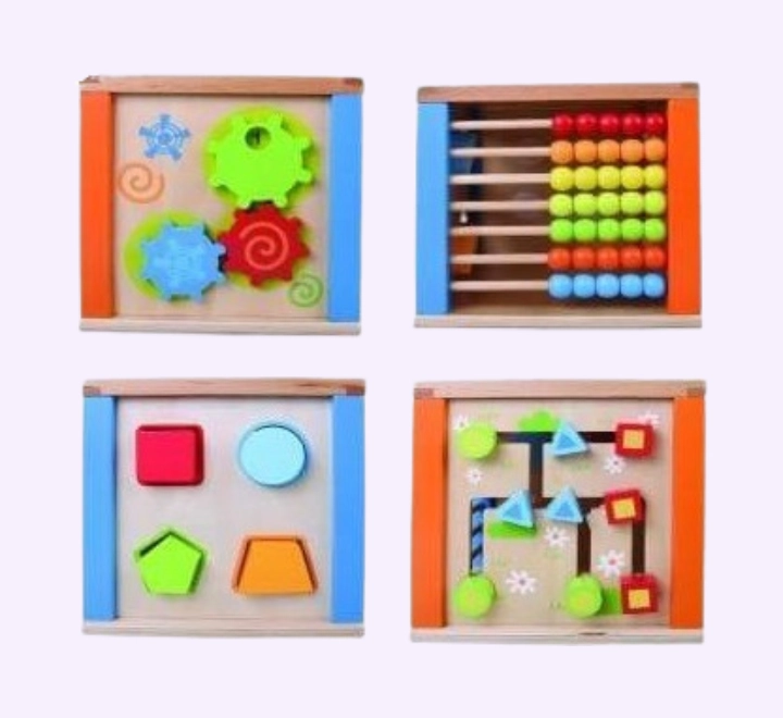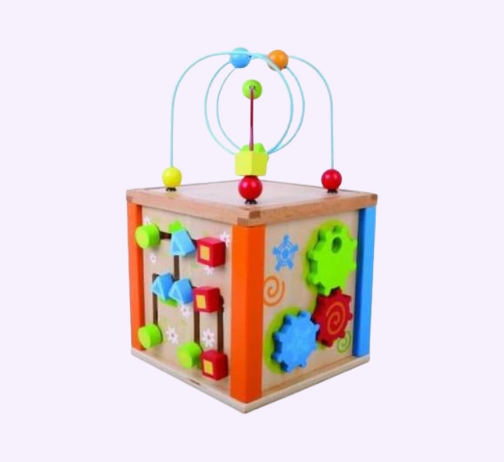 مكعب أنشطة + متاهة من بيت تويز. مكعب أنشطة من الخشب الصلب مع مجموعة متنوعة من الأنشطة. يتضمن المكعب: مطابقة الأشكال، متاهة، خرز، ولعبة مطابقة الأشكال. مصنوع من الخشب الصلب ومطلي بطلاء غير سام. توجد متاهة خرز في أعلى المكعب. يوجد على كل جانب من المكعب نشاط مختلف: لوحة عد، مقابض منزلقة، تروس، وساعة. يساعد الطفل على التعرف على الألوان والأرقام والأوقات وغيرها. لعبة مطابقة الأشكال مع الأشكال: المربع، الدائرة، شبه المنحرف، والخماسي. الحجم: ٢٠ × ٢٠ × ٥٥ سم. في نهاية اللعبة، يمكن قلب الجانب العلوي لدخول المكعب وتوفير مساحة في التخزين.